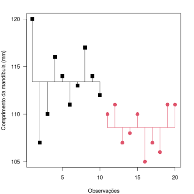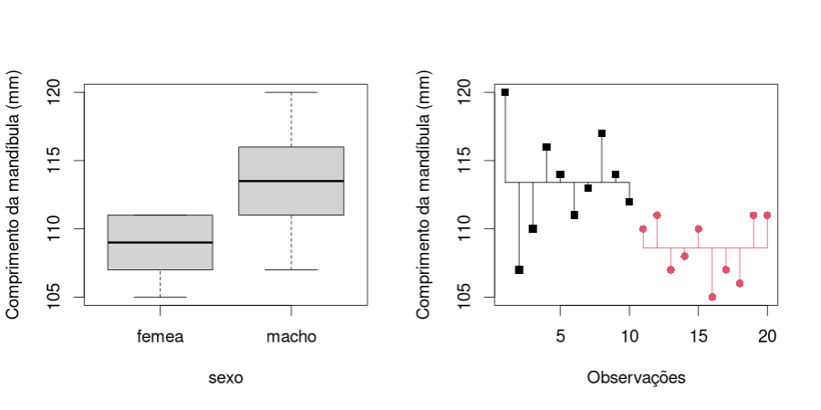 x11(width = 12, heigh = 6) par(mfrow = c(1, 2), cex = 1.5) boxplot(chacal ~ sexo, ylab = "Comprimento da mandíbula (mm)") plot(1:20, chacal, pch = rep(c(15, 16), each = 10), col = rep(1:2, each = 10), xlab = "Observações", ylab = "Comprimento da mandíbula (mm)") medsex <- c(mean(macho), mean(femea)) segments(x0 = 1:20, y0 = chacal, y1 = rep(medsex, each = 10), col= rep(1:2, each = 10)) lines(c(1,10), c(medsex[1], medsex[1]),col=1) lines(c(11,20),c(medsex[2], medsex[2]),col=2)