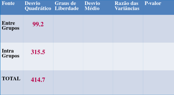 Agora nossa tabela está quase completa, se calcularmos a razão entre os desvios médios explicado pelo não explicado, temos o cálculo da estatística da ANOVA, o F-Fisher: