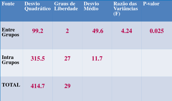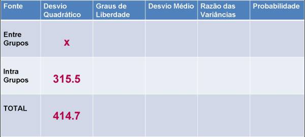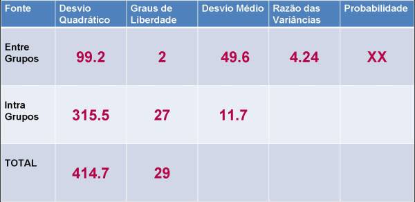 Agora nossa tabela está quase completa, se calcularmos a razão entre os desvios médios explicado pelo não explicado, temos o cálculo da estatística da ANOVA, o F-Fisher: