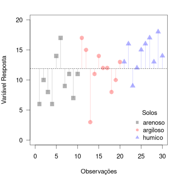 par(mar = c(4,4,2,1), las = 1, cex = 1.5) colvector <- rep(cols, each= 10) plot(x = 1:30, y = cultivar$producao , ylim = c(0,20), xlim = c(0, 30), pch=(rep(c(15,16,17), each=10)), col = colvector, ylab = "Variável Resposta", xlab = "Observações", cex = 1.5) for(i in 1:30) { lines(c(i,i),c(cultivar$producao[i], mean(cultivar$producao)), col = colvector[i]) } abline(h = mean(cultivar$producao), lty = 2) legend("bottomright", legend = c("arenoso", "argiloso", "humico"), pch = 15:17 ,col = cols, title = "Solos", bty = "n")